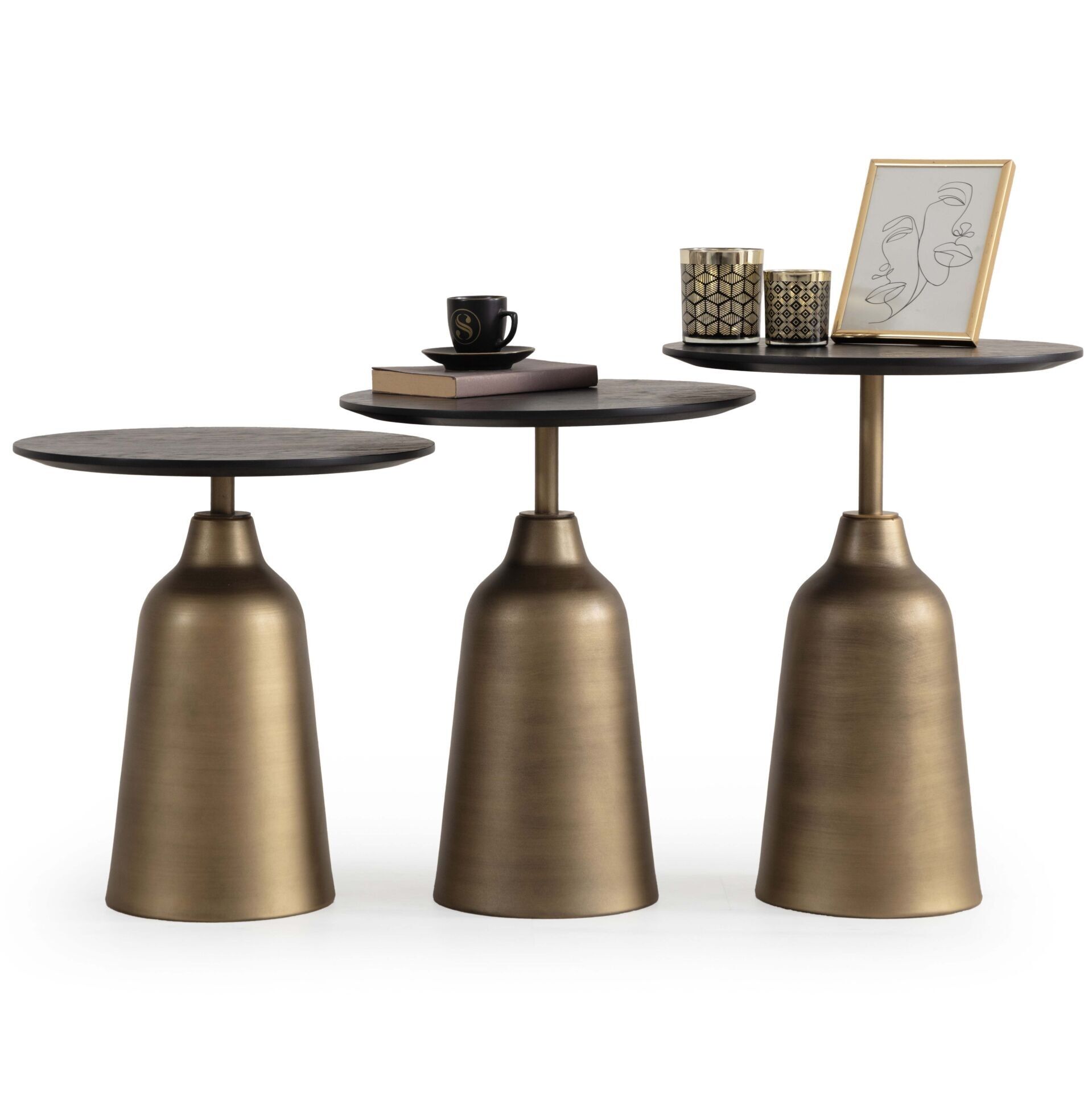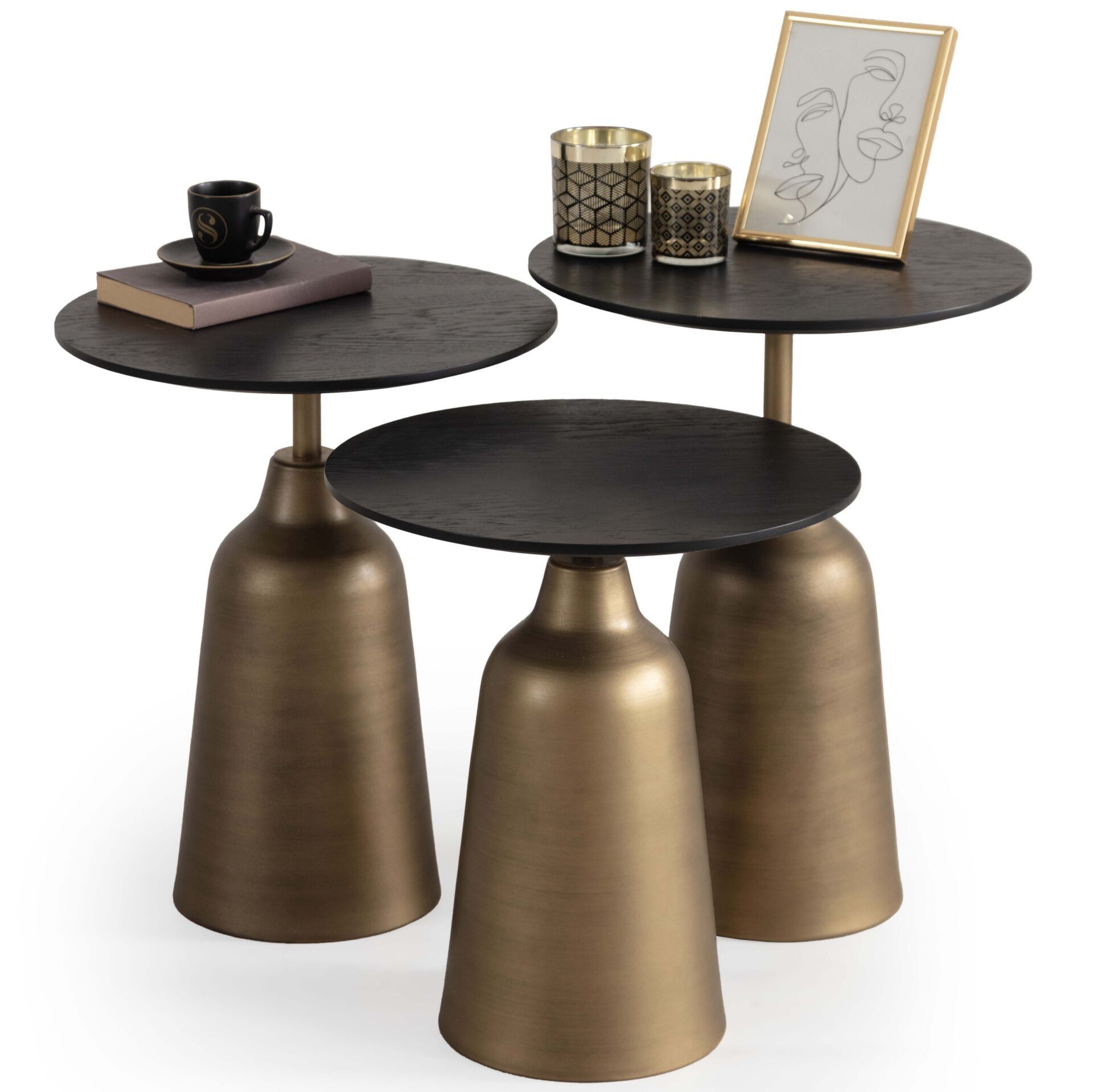 SHOWDEKO Loft Üçlü Siyah Renk Ahşap Kaplama Üst Tabla Pirinç Metal Renk Ayak Zigon Sehpa Seti 43x43cm
