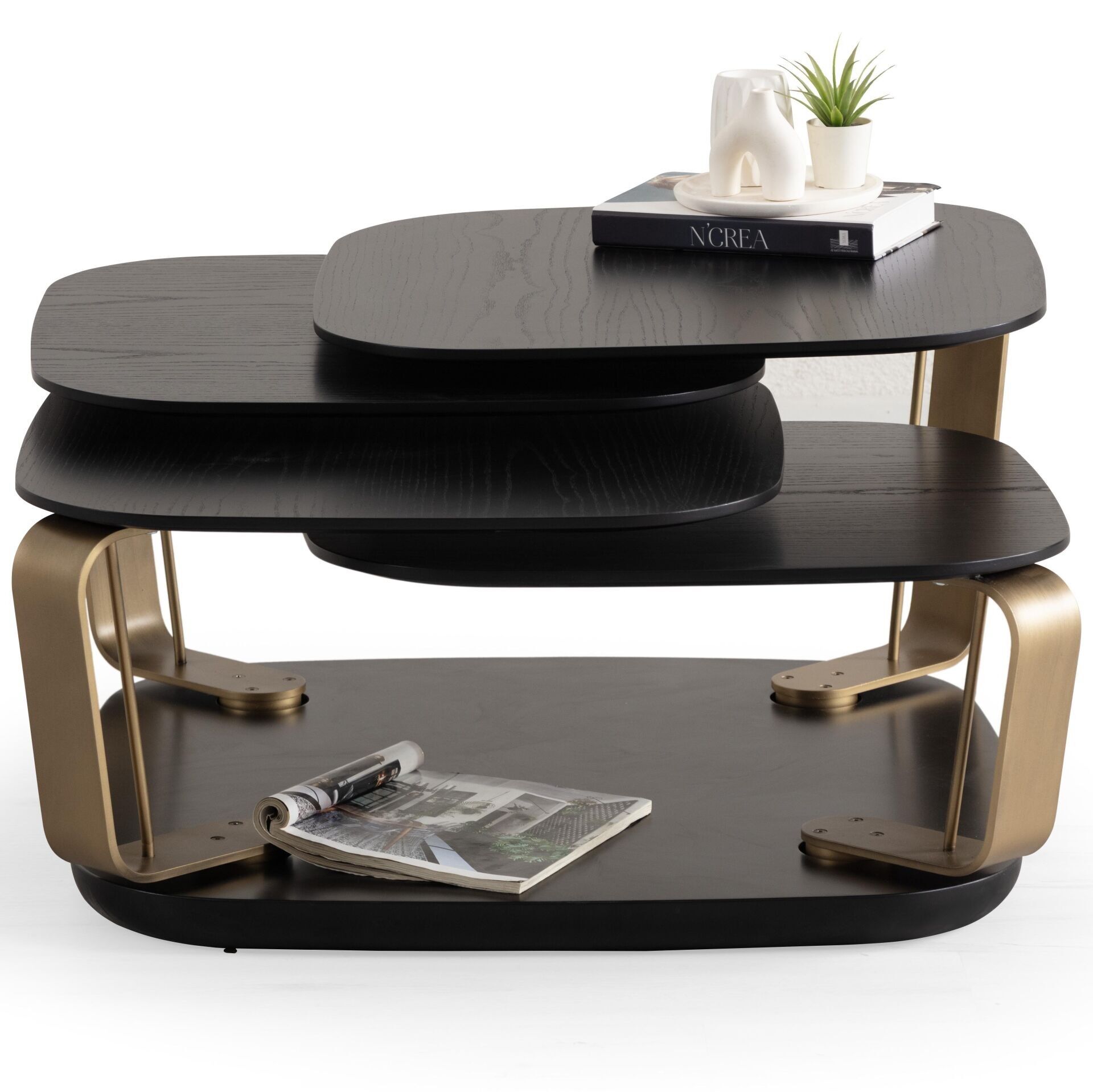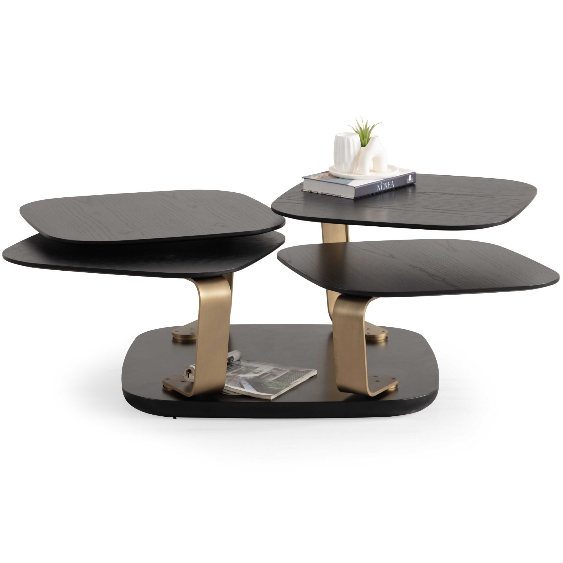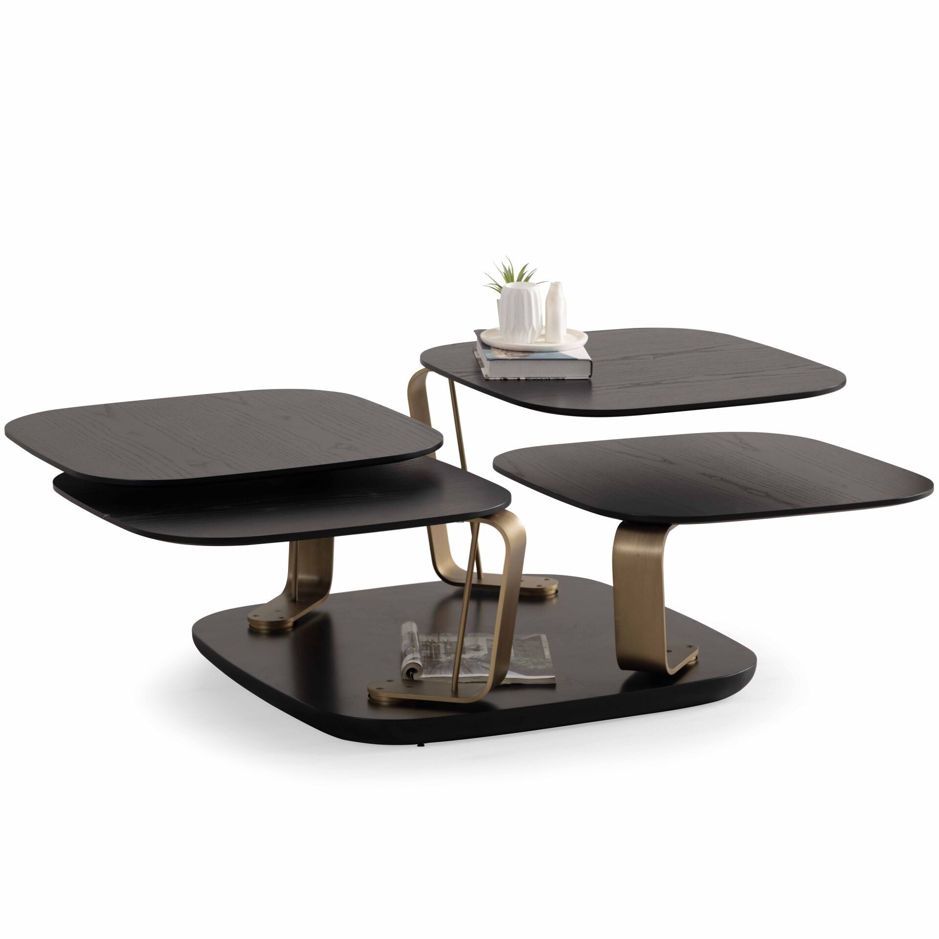 Bentley Vol2 Siyah Ahşap Kaplama Metal Döner Mekanizmalı Dört Tablalı Akıllı Orta Sehpa 91x91cm / 140x140cm