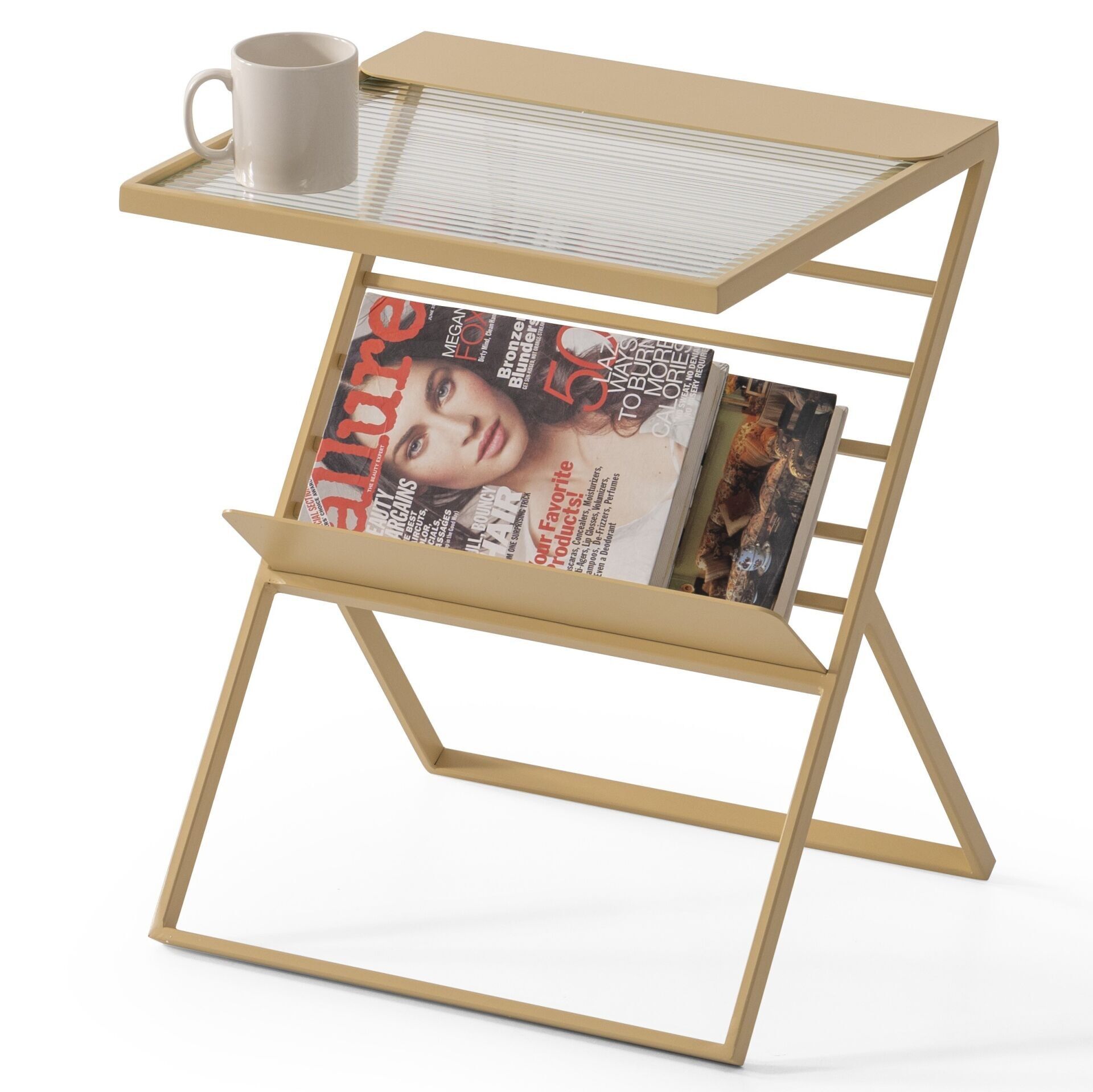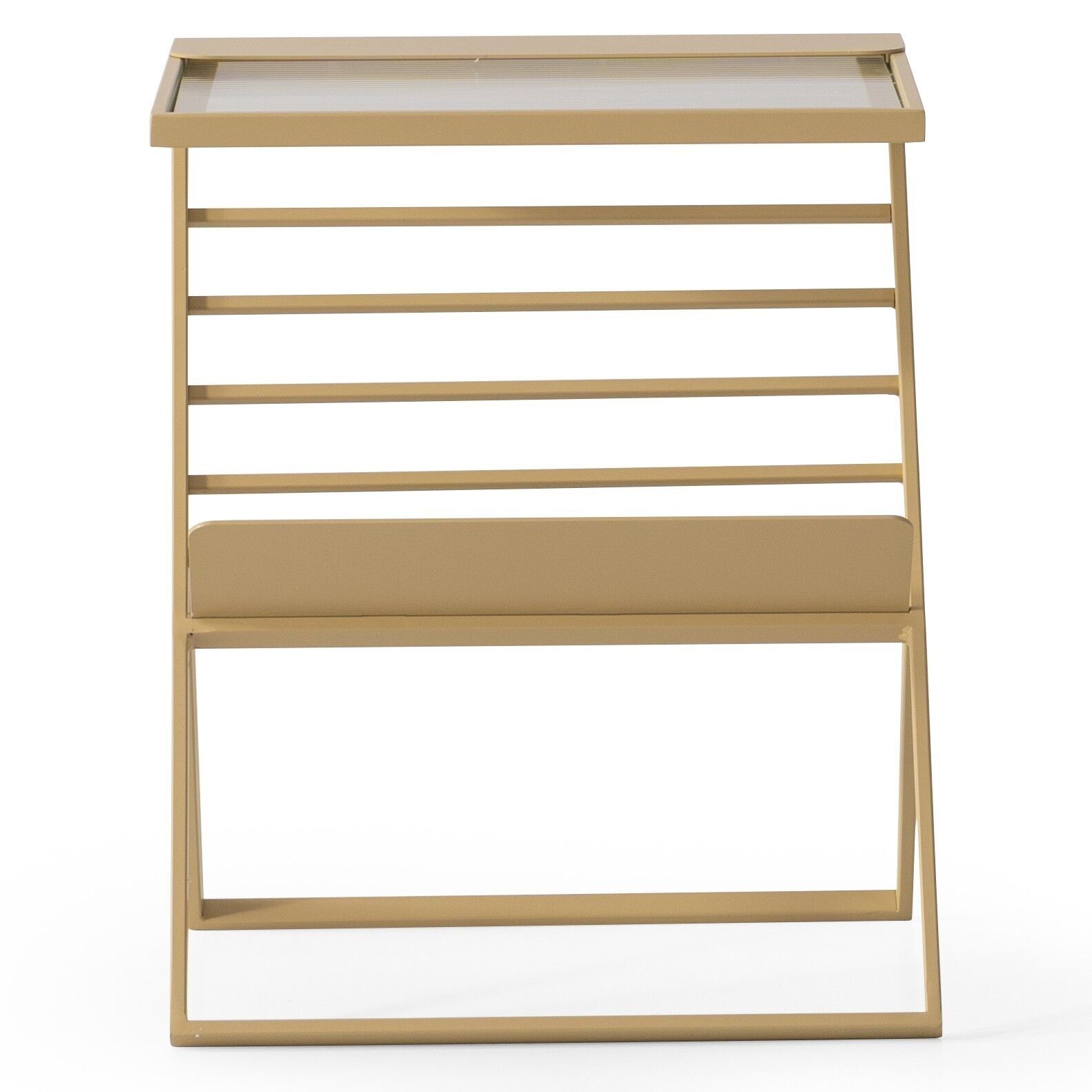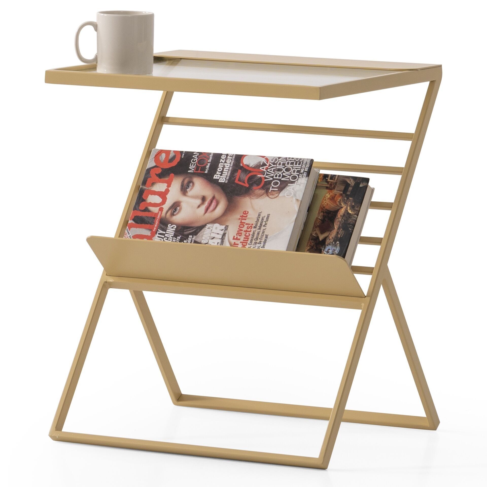 Neden Nixi Metal Eskitme Altın Renk Cam Rafli Magazinlik Gazetelik Yan Sehpa?