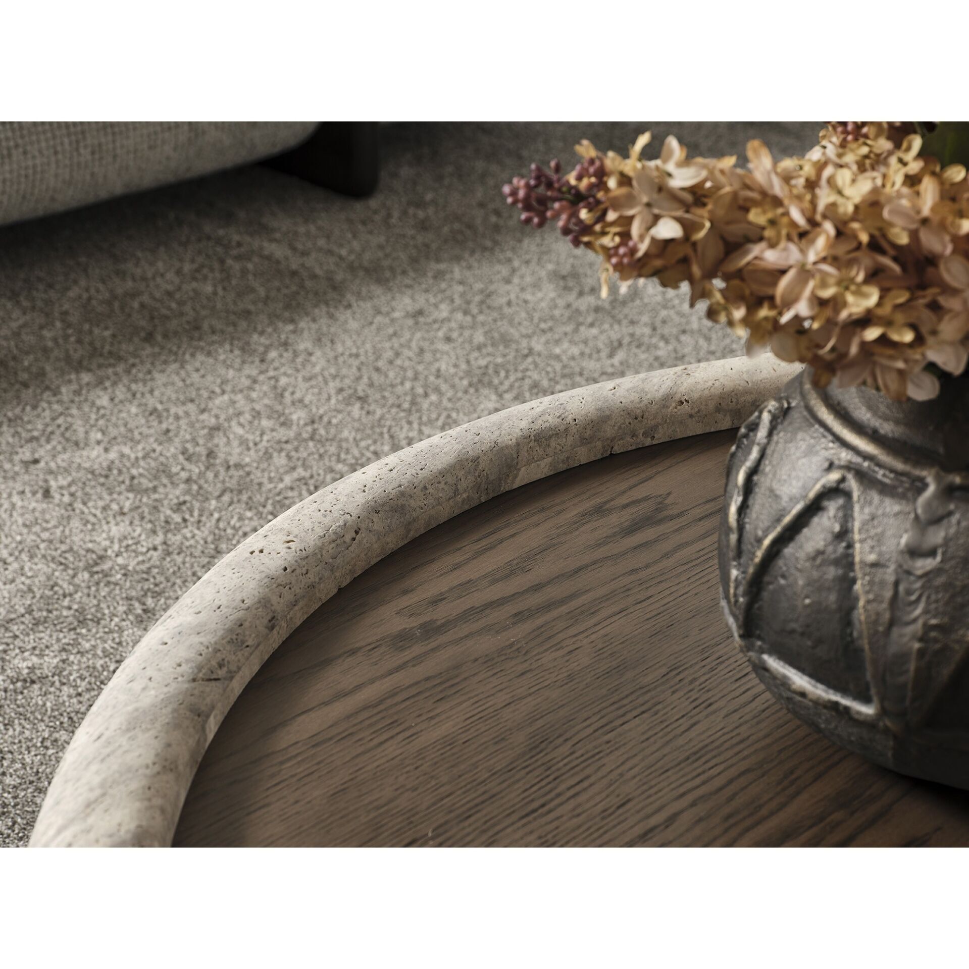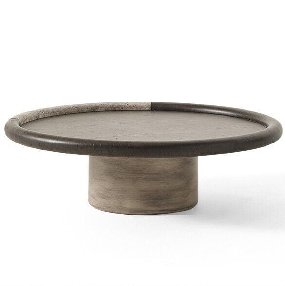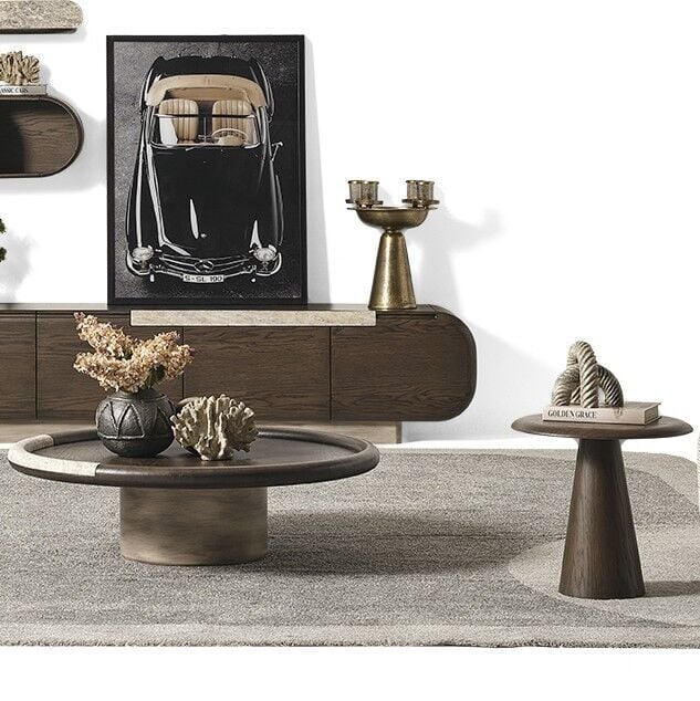 Mira Ahsap Yuvarlak Traverten Orta Sehpa Ç112xY34cm, farklı kombinlere kolayca uyum sağlar.