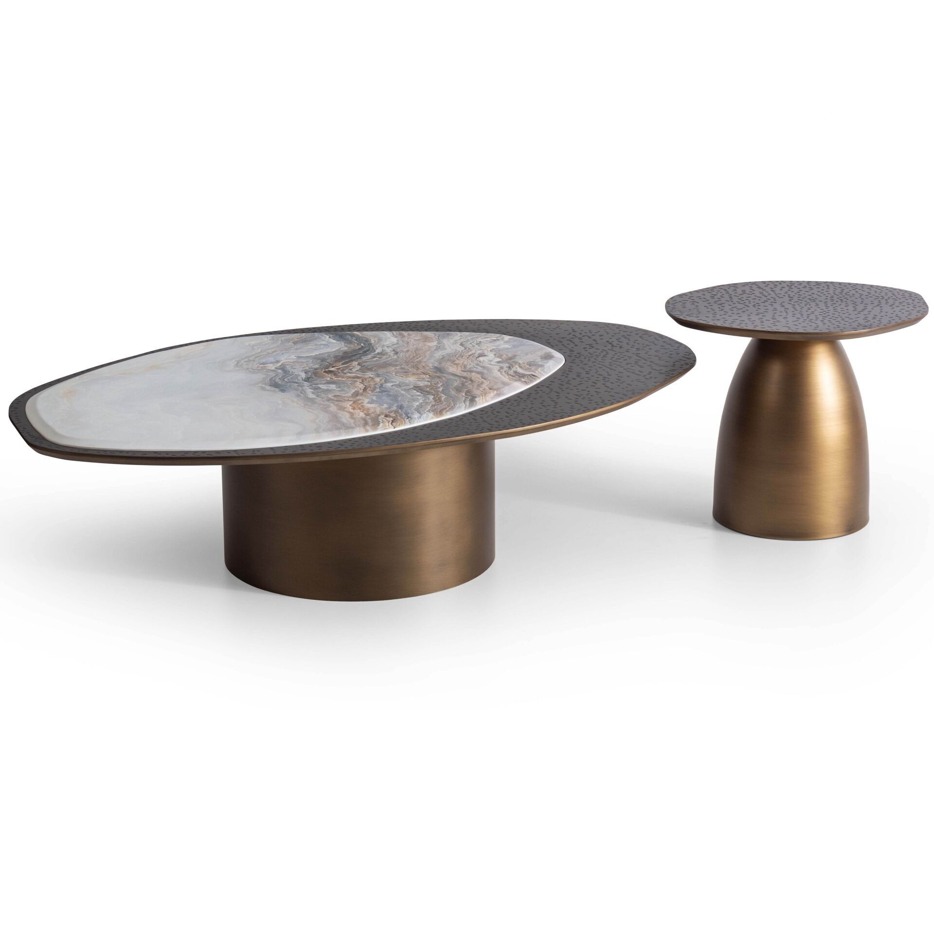 Ruffles Vol1 İkili Pirinç Mermer Görünümlü Orta + Yan Sehpa Seti G132xD84cm