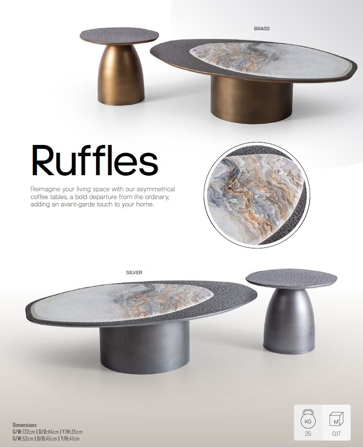 Ruffles Vol1 İkili Pirinç Mermer Görünümlü Orta + Yan Sehpa Seti G132xD84cm, günlük kullanımda konforu ve uzun ömürlü performansı bir araya getirmek üzere tasarlanmıştır.